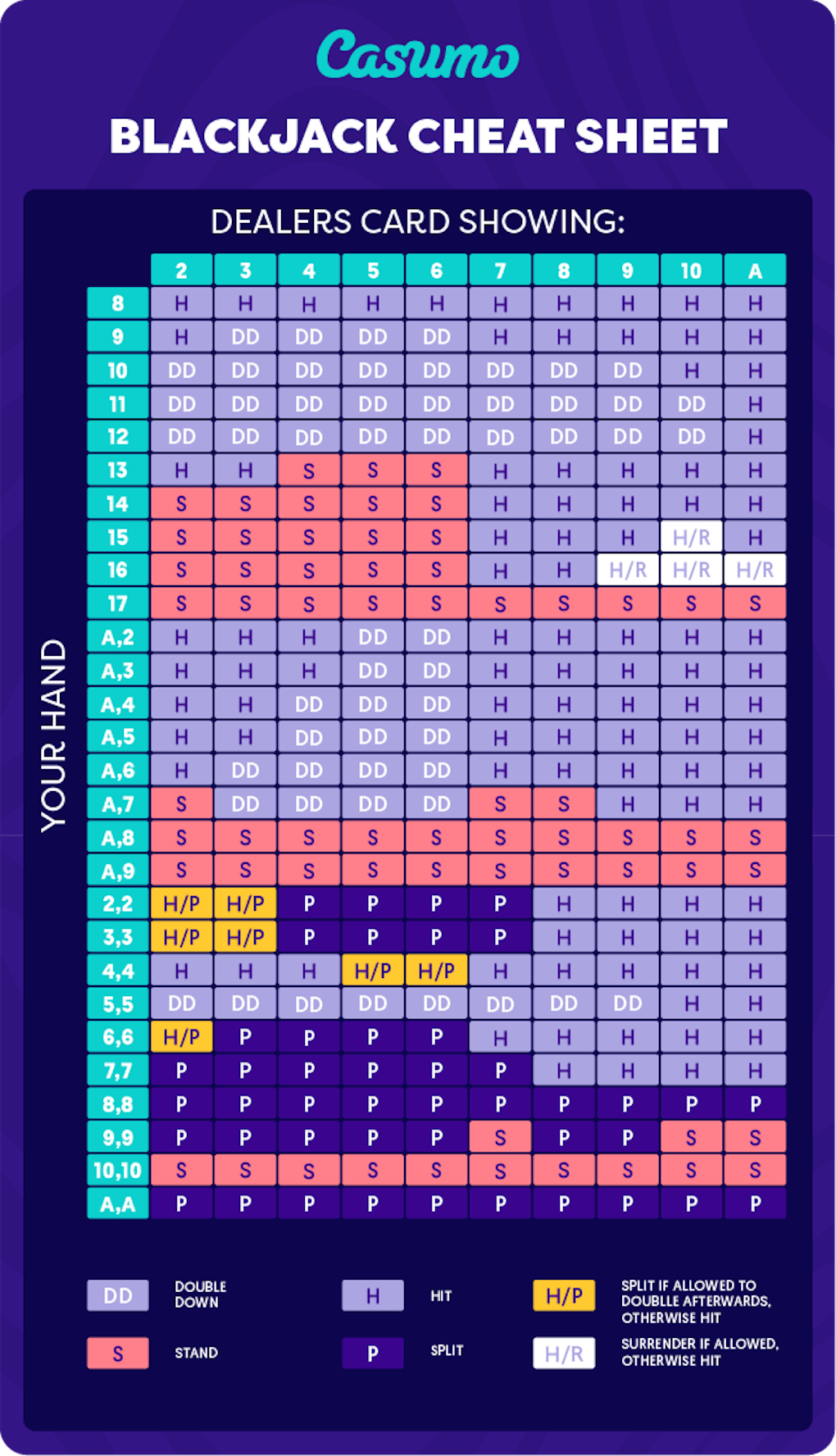 Price and other details may vary based on product size and color. The following printable blackjack cheat sheet is for Vegas USA blackjack played with 4 or more decks and with a dealer that hits on a soft 17. Along one edge of the grid.